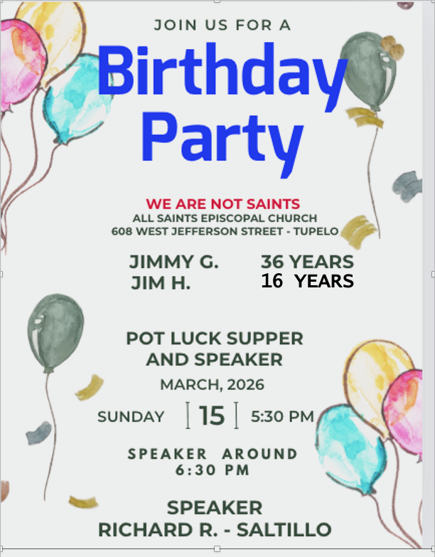 March 21, 2026 | 5:00 pm – 8:00 pmWe are not Saints Group March Birthdays 2026